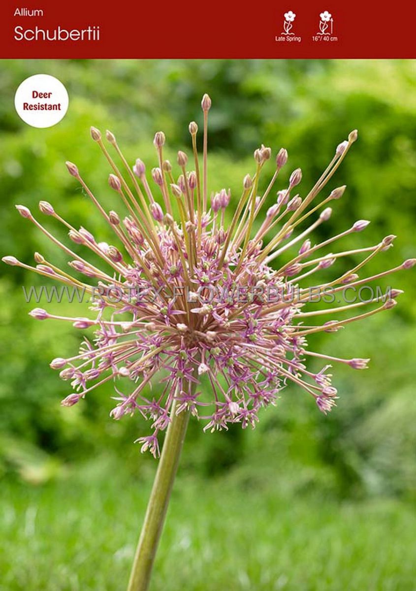 Allium ‘Schubertii’ has spectacular loose star-shaped pink-purple flowers that blooms in giant, spherical umbels. Seed heads dry after blooming, great for flower arrangements and ornamental purposes.
