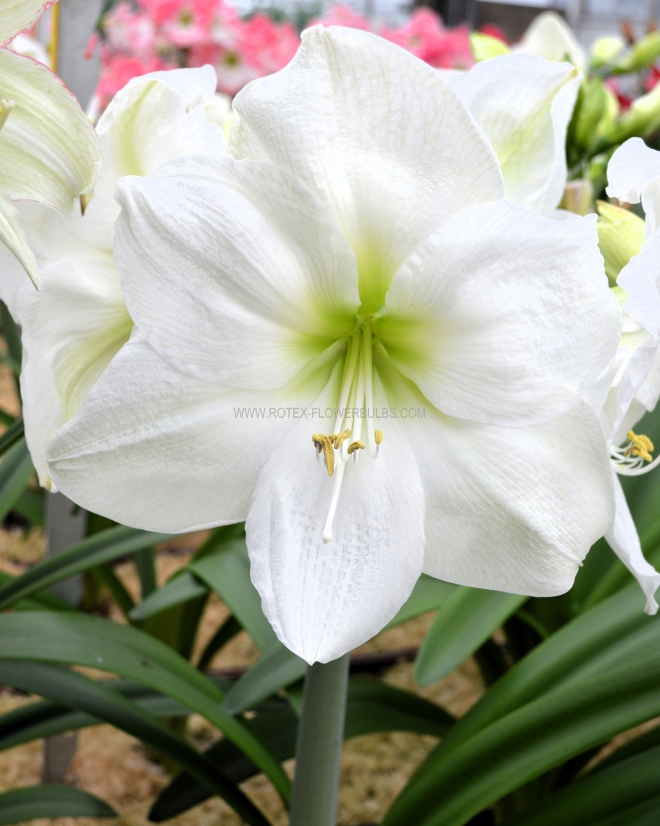 Amaryllis ‘White Cream’ has large radiant white flowers, the stamens and pestle are also completely white.