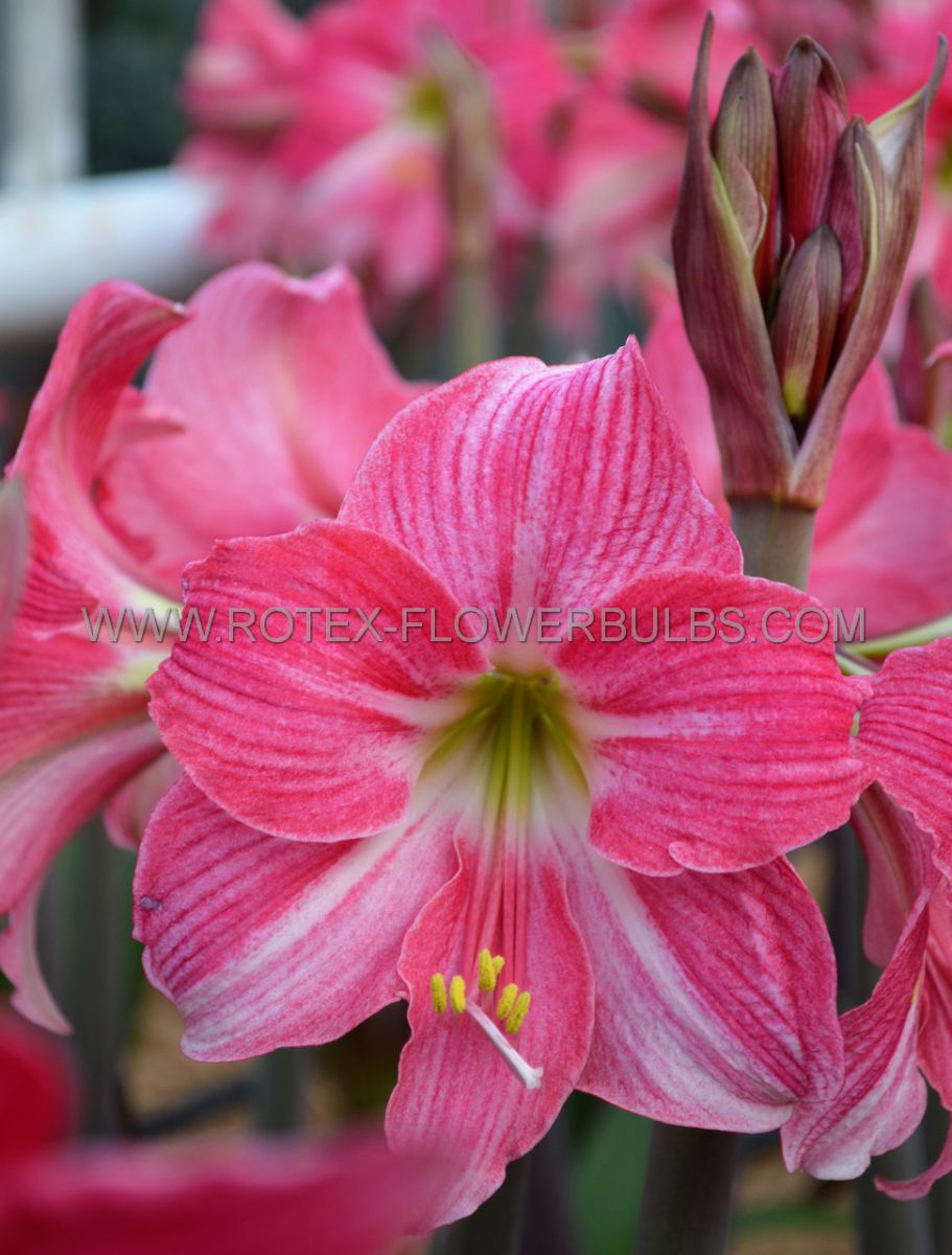Amaryllis ‘Neon’ has vibrant neon-pink flowers with white-pink stripes, apple green center.