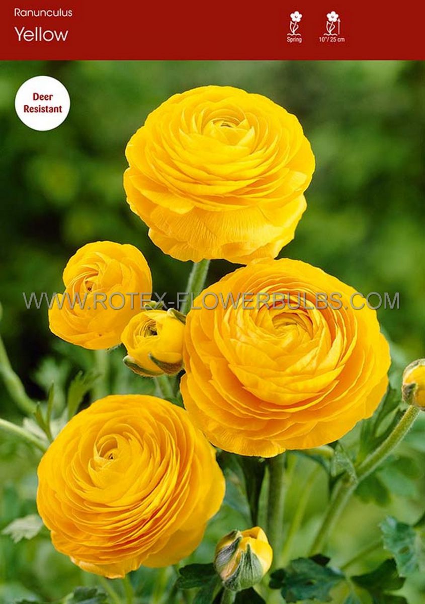 Ranunculus ‘Yellow’ has brilliantly yellow flowers with multiple layers of delicate, crepe paper-thin petals.