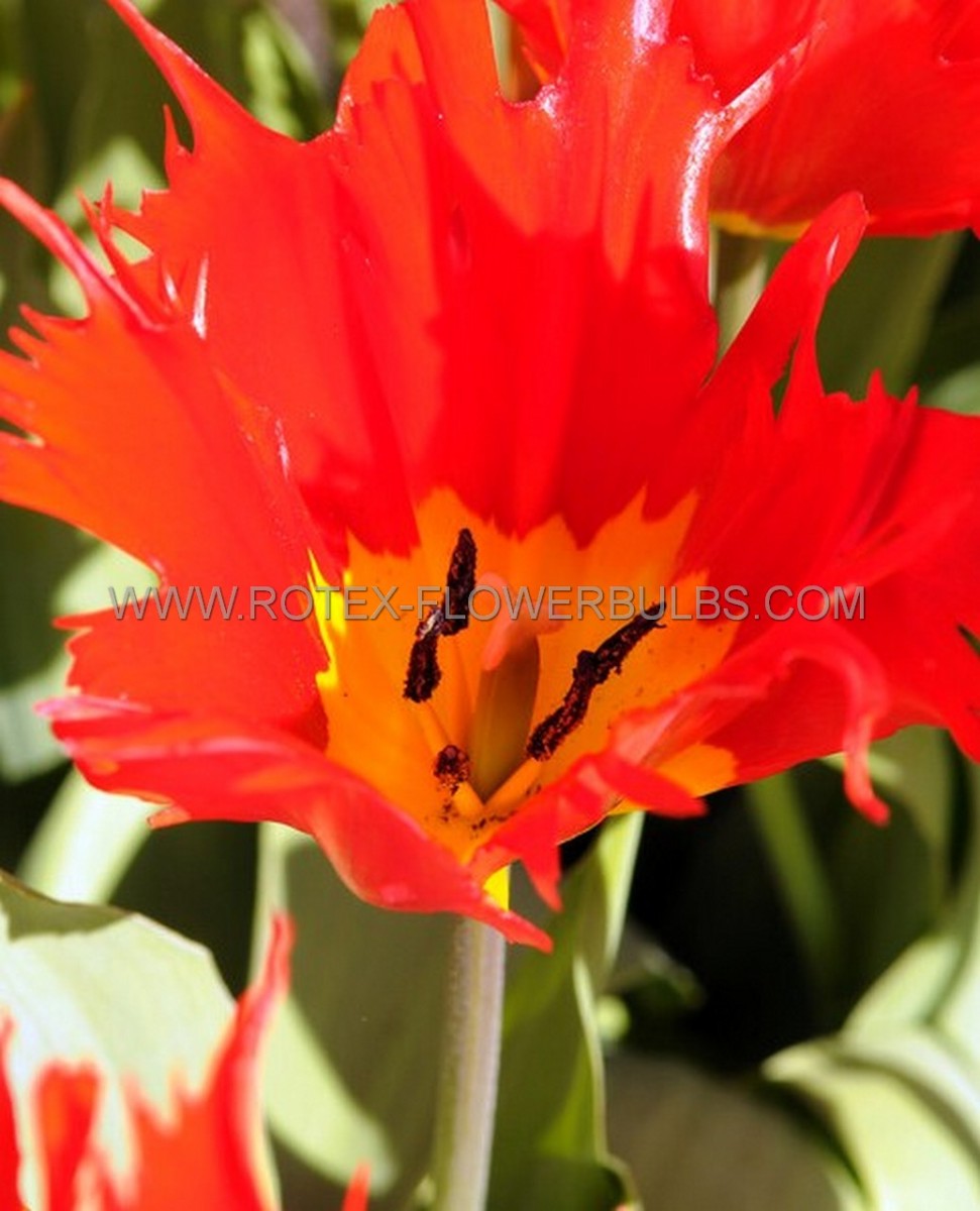 Tulipa 'Robbedoes' has fiery red flowers with deeply incised irregular fringed spiky petals.