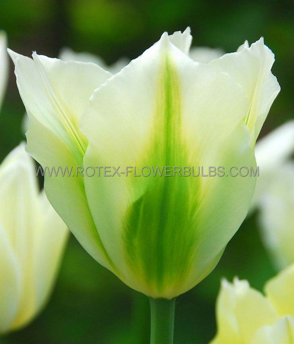 Viridiflora Tulips are not extensively cultivated. Most of them are related to Single Late tulips and appreciated by gardeners because of their unusual flower characteristics. The main color of the flowers is green, this is an attractive and rare characteristic amongst flowers. The green part of the flower mostly shows a more or less broad stripe from the base to the point of the petals.. Great for beds, borders and cut-flowers. They are also known for their exceptionally long flowering capability, viridiflora are late blooming tulips.